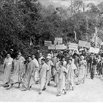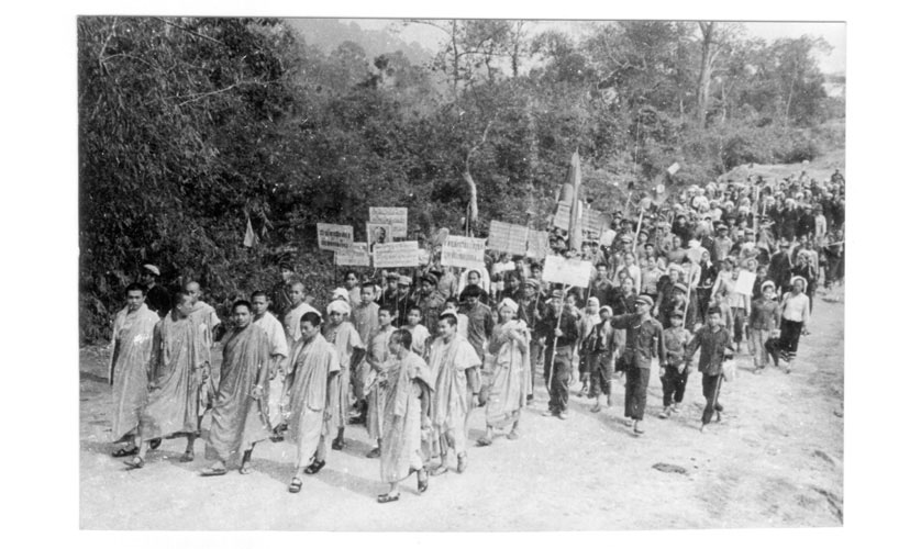 A march of Buddhist monks, villagers and soldiers supports the revolutionary forces of the Pathet Lao during the Civil War. A large photograph of Prince Souphanouvong, a revolutionary leader, is carried by them (1960).