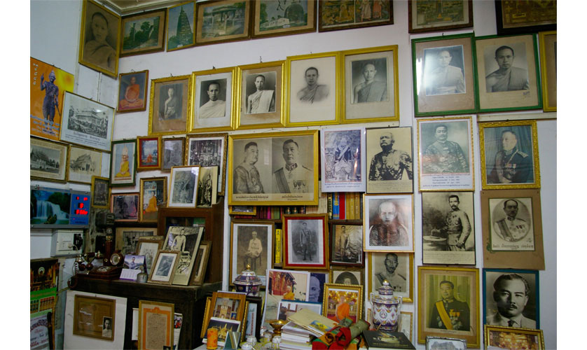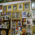 Exhibition of photographs set up by Pha Khamchan at Vat Saen Sukharam, in 1995. Note the portraits of himself on top, under images of sacred Buddhist sites, and, on the right side, portraits of Lao kings next to portrait of Prince Souphanouvong, the first President of the Lao People's Democratic Republic.
