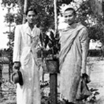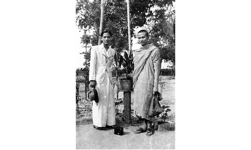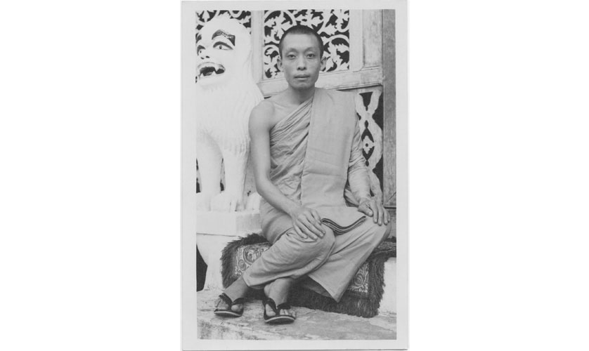 Pha Khamchan Virachitta Maha Thela practising Vipassana Meditation at the Buddha's birthplace, Lumpini, Nepal, during a pilgrimage to Sacred Buddhist Sites of India and Nepal in 1968. Photograph taken by an accompanying monk. This photograph is part of the exhibition set up by Pha Khamchan inside the Sim of Vat Saen.