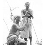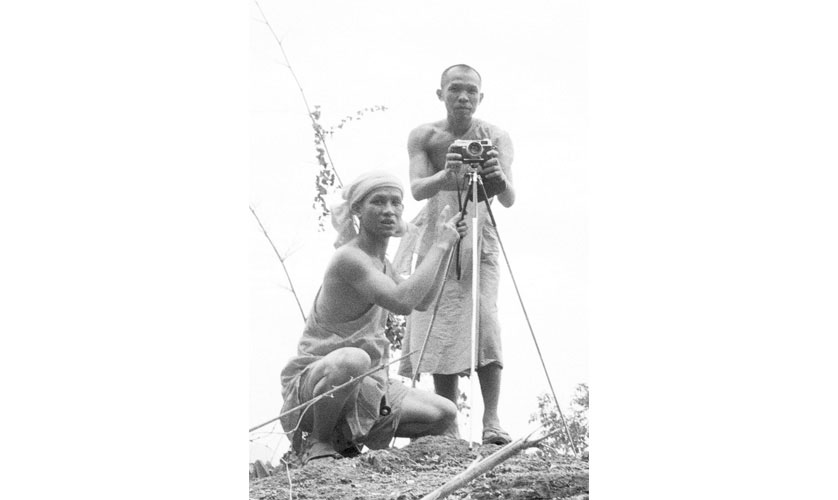 Two monk photographers from Luang Prabang taking a photograph of an approaching train during a voyage in Thailand in the early 1970s. They are being photographed by a third monk who accompanied them.