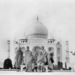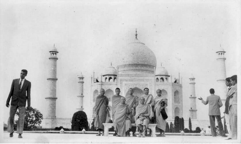 Senior monks from Laos are posing for a portrait in front of the Taj Mahal during a pilgrimage to India in January 1957. Sitting from l-r: Somdet Pha Sangkhalat Thammayana Maha Thela and Pha Khamfan Silasangvara Maha Thela.